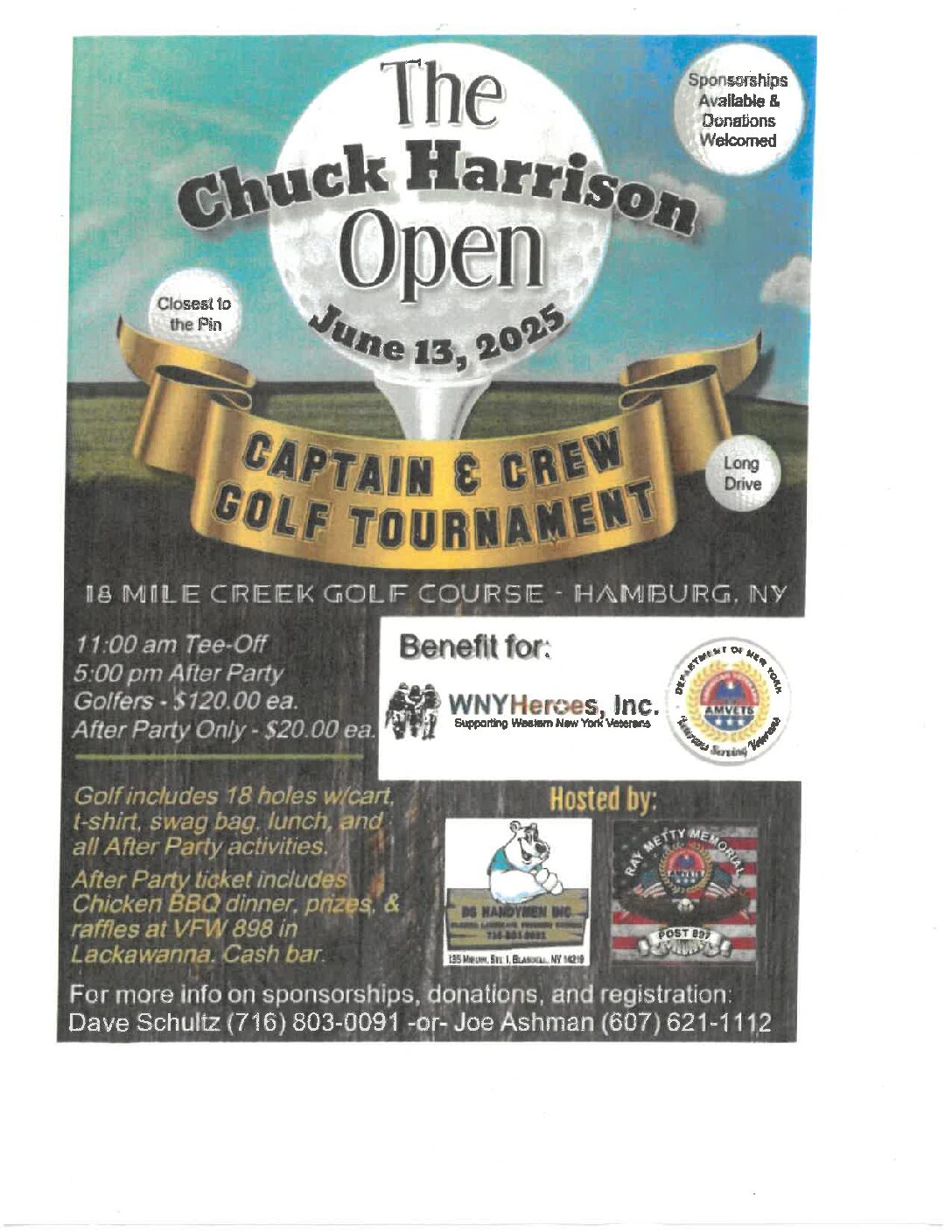 The Chuck Harrison Open 18 Mile Creek Golf Course- Hamburg, NY Golf includes 18 holes w/ cart, t-shirt, swag bag, lunch, and after party activities. After party tickets includes BBQ […]